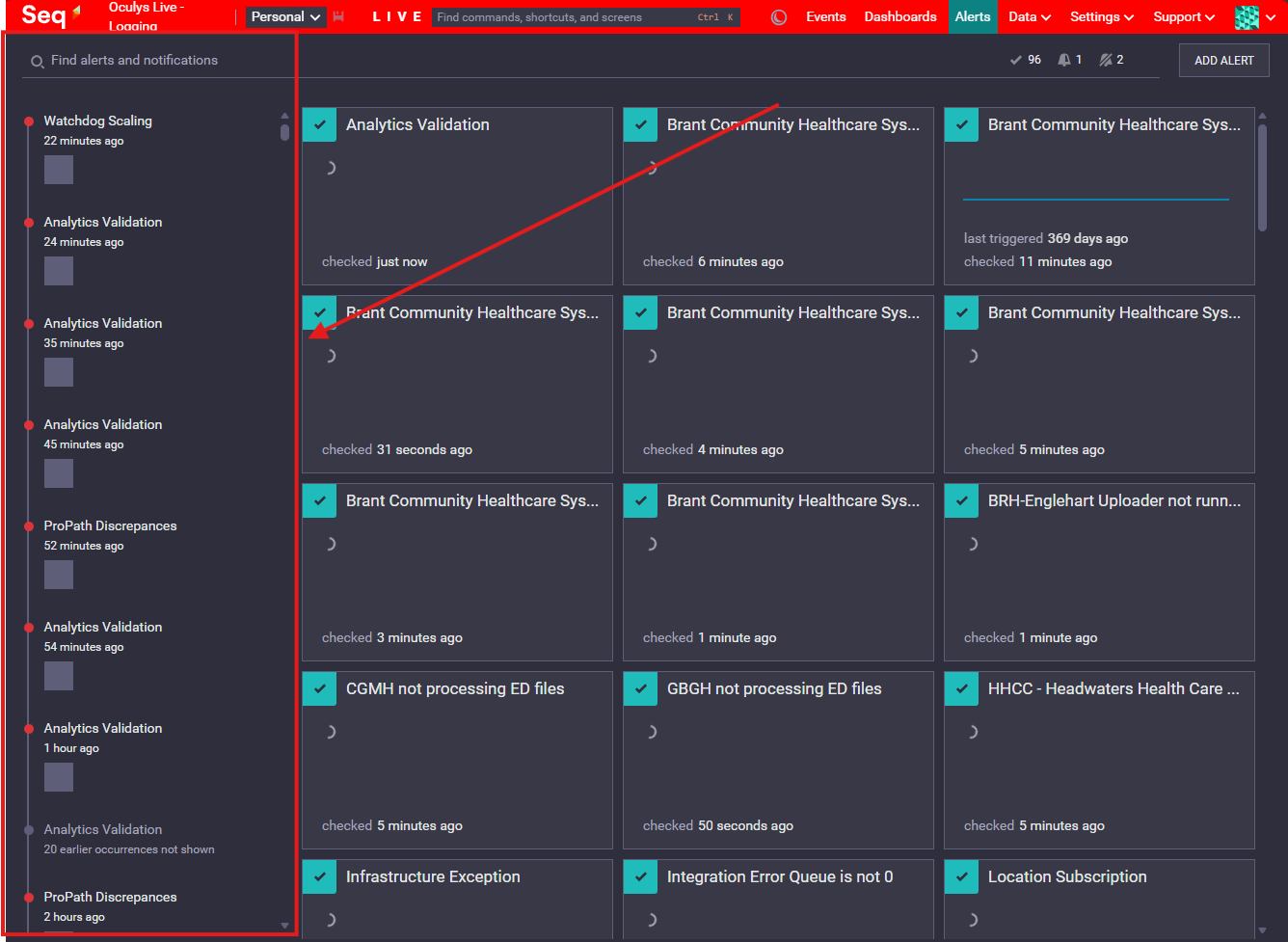 The trigger history of seq alerts can be viewed from just entering the Alerts dashboard on seq, The left-hand side of the dashboard will show the trigger history