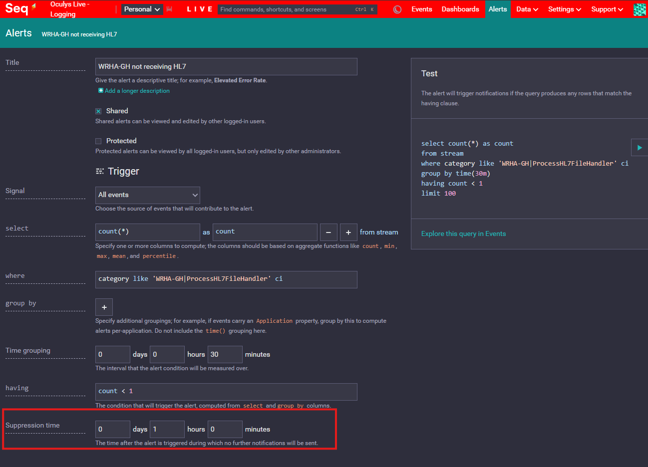 in the above screenshot, once the alert has been triggered, it will only trigger again after 1 our if the conditions are met within the last 30 mins (Time Grouping)