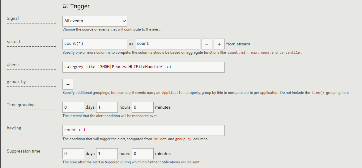 - HAVING clause (threshold/condition to trigger the alert)