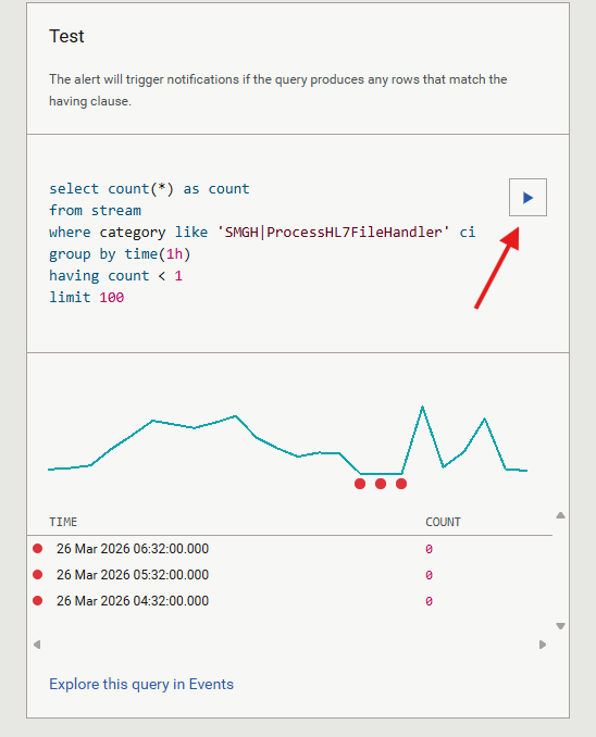 - In the alert editor, go to the Test section on the right side and press the Play (▶) button.